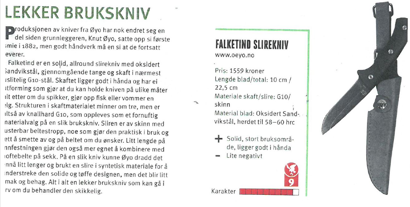 Sitat fra testen: "Hvis du er ute etter en lett jakt/slaktekniv er ikke Falketind førstevalget, men hvis vekta ikke er avgjørende, og du ønsker en dønn solid og sikker kniv, er Falketind absolutt en kandidat" + Holder eggen lenge, godt grep selv når det er vått, skaft tåler fukt og skikkelig rengjøring"